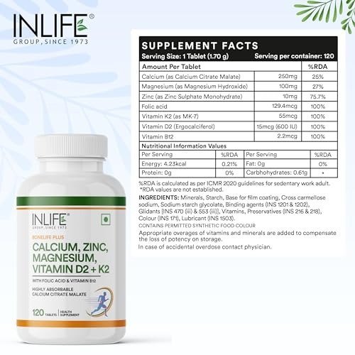 - INLIFE Calcium Magnesium Zinc with Vitamins D and K2 is a vegetarian-friendly supplement conveniently packed into a single, easy-to-swallow tablet. It is formulated to help promote the health of bones, muscles, and nerves.