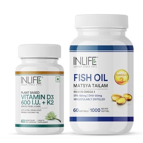 INLIFE Fish Oil with Vitamin D3 | 1000mg Omega-3 & 600 IU Plant-Based Vitamin D3 with K2 | Sourced from Lichen | Supports Heart, Brain, and Joint Wellness – 60 Softgels & 60 Vegetarian Liquid Capsules
