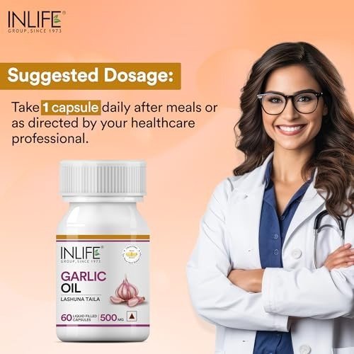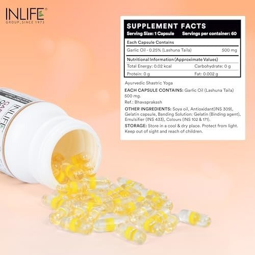 Garlic is a powerful herb renowned for supporting overall wellness. It possesses potent antioxidant properties, which help protect cells from damage and vulnerability to illness. INLIFE Garlic Oil Capsules are a distinctive blend offering a range of health benefits. Garlic is rich in protein, sulfur, potassium, vitamins A, B, and C, calcium, zinc, and various other nutrients. This product is a natural Ayurvedic supplement.