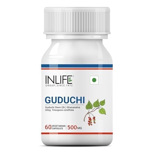Guduchi has been traditionally utilized in Ayurvedic medicine to enhance immune function and support cellular protection. It offers a natural approach to fortifying the body?s cells. INLIFE Guduchi Capsules are formulated with an extract sourced from Guduchi stems, standardized to contain over 3% Bitters. Each capsule delivers 500mg of pure Guduchi stem extract. The recommended dosage is 1-2 capsules daily after meals, or as directed by your healthcare provider. For optimal benefits, we recommend taking one capsule twice a day with water after meals. Consistent use of this supplement is advised to achieve the best results. Our product features a highly effective blend of trusted natural ingredients, carefully processed and manufactured in a GMP-certified facility to ensure safety. INLIFE Guduchi Stem (Giloy) extract capsules are suitable for both vegans and vegetarians, made with gluten-free capsules and free from artificial additives.