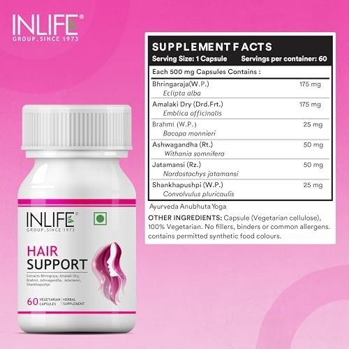 Inlife Hair Support capsules are herbal Ayurvedic supplements, formulated according to Ayurveda Anubhuta Yoga principles. Crafted from premium natural ingredients, they help prevent hair fall. For best results, take 1-2 capsules daily after meals, or follow your healthcare professional?s advice.