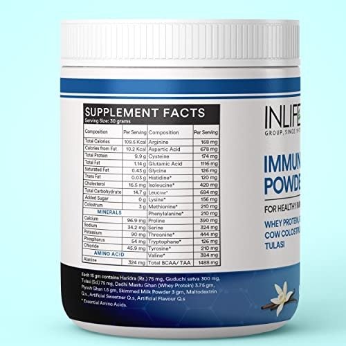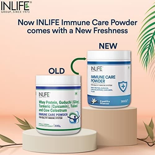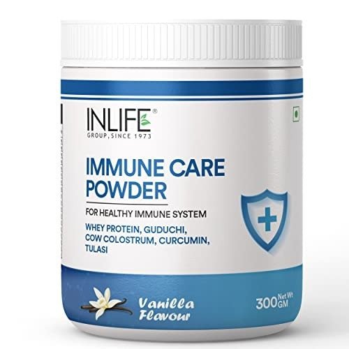 INLIFE Immune Care powder, fortified with Whey Protein, is produced according to stringent quality standards. This Ayurvedic supplement features a powerful blend of Whey Protein, Turmeric (Curcumin), Guduchi (Giloy), Tulasi, and Colostrum, all known for their immune-boosting properties. Designed to keep your immune system resilient and responsive, it supports healthy immune function, helps the body manage everyday stress, and restores overall balance, thereby safeguarding your well-being. The addition of whey protein, combined with these potent herbs, delivers a range of impressive health benefits, enhancing your body?s natural defenses against various ailments. Crafted with a carefully selected mix of trusted natural ingredients, this product is manufactured in a GMP-certified facility, ensuring both safety and efficacy. Approved by Ayush, this supplement is ideal for long-term use to help you maintain robust immunity and protect yourself naturally from infections.