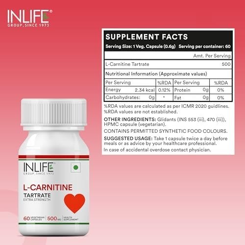 INLIFE L-Carnitine is an amino acid supplement recognized for supporting overall wellness, enhancing fat metabolism, boosting energy levels, and helping to reduce muscle fatigue. It is also beneficial for those on a diet, as it may help decrease sensations of hunger and tiredness. For best results, take two capsules once daily, or follow the advice of your healthcare provider.