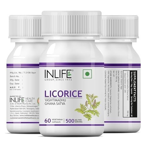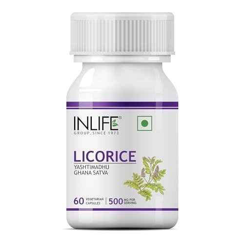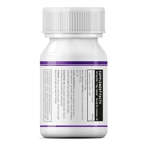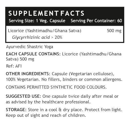 Each vegetarian capsule delivers 500 mg of pure Licorice (Yastimadhu/Glycyrrhiza Glabra) extract, standardized to contain 20% glycyrrhizinic acid. For best results, take one capsule once or twice daily between meals with a full glass of water, or as advised by your healthcare provider. If you have a sensitive constitution, start with one capsule daily between meals with plenty of water.