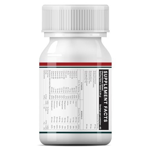 - This supplement features a comprehensive blend of vital vitamins, including A, C, D, E, K, and a full spectrum of B vitamins (B1, B2, B3, B5, B6, B7, B9, and B12). It is also enriched with key minerals such as calcium, magnesium, zinc, selenium, copper, manganese, chromium, molybdenum, potassium, and iodine. Additionally, the formula is enhanced with natural extracts like ashwagandha, ginseng, and grape seed extract to further support overall wellness.