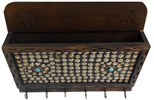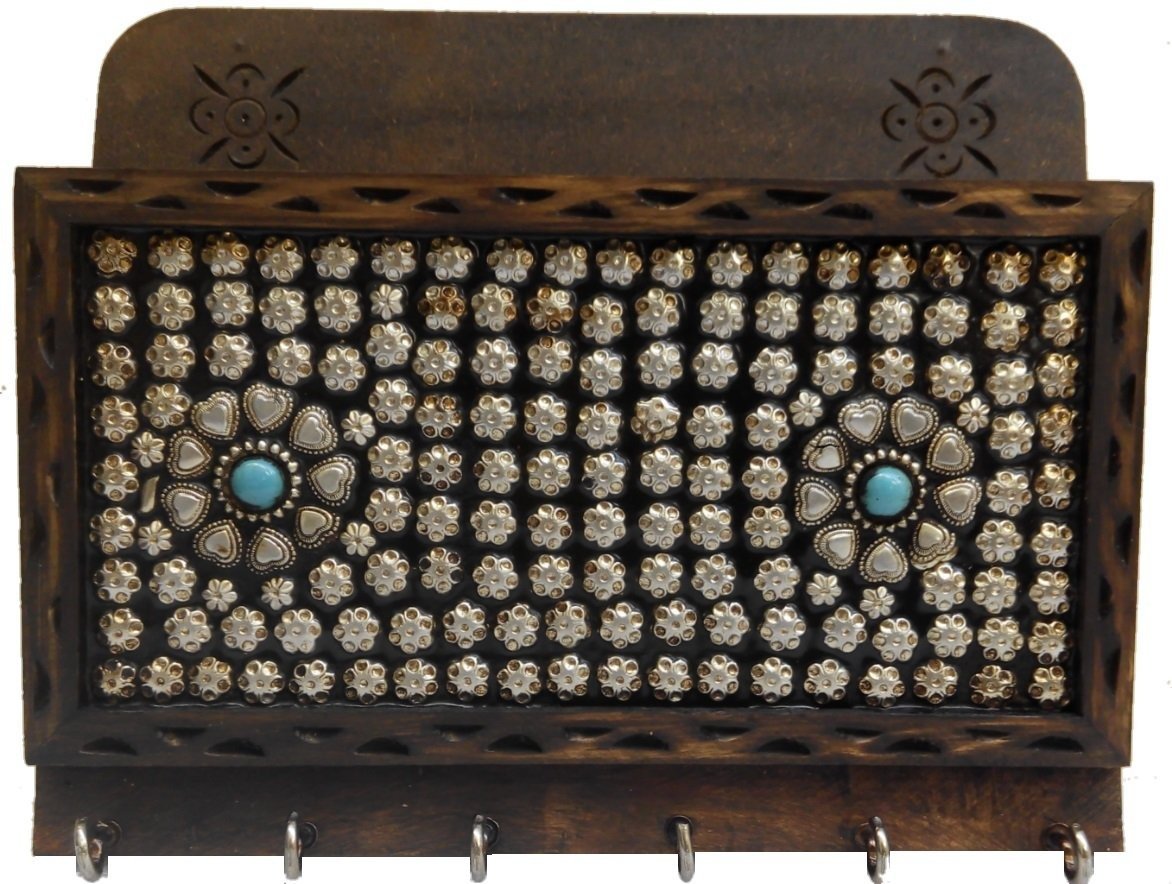 JaipurCrafts Beautiful Silver Flower Studded Wooden Key Holder Cum Magazine Holder (6 Hooks, Brown, Silver) – Fast Shipping to USA & Canada