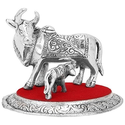 JaipurCrafts Kamdhenu Cow and Calf Showpiece – 10.16 cm (Aluminium, Silver, Red) – Fast Shipping to USA & Canada
