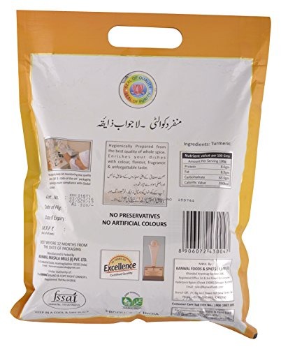 This turmeric powder contains pure turmeric and is packaged in an appealing pouch. It is free from artificial colors and has a shelf life of 12 months. Please store it in a cool, dry location.