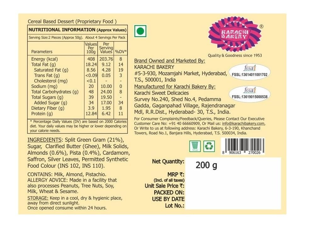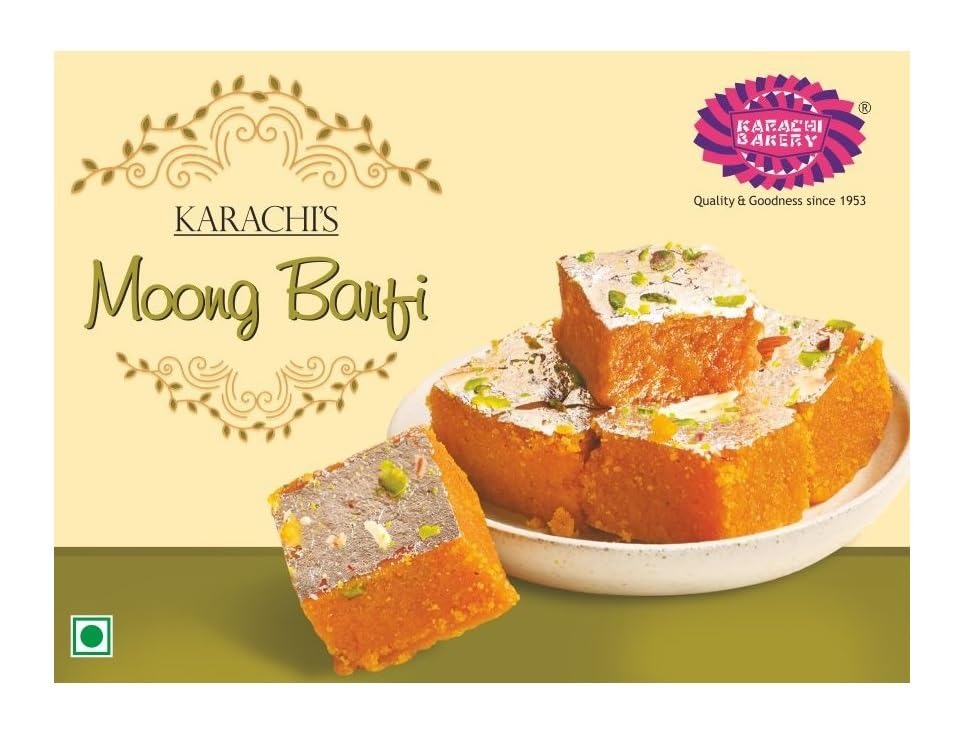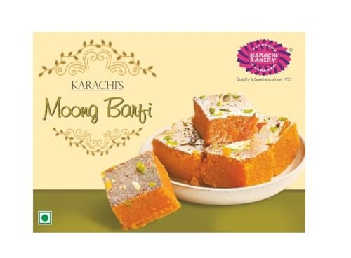 Variation 2: Are you yearning for a taste of genuine Indian sweetness-Treat yourself to the divine Moong Dal Barfi from Karachi Bakery. Made with top-quality moong dal and fragrant, pure ghee, this confection features a melt-in-your-mouth texture complemented by just the right sweetness. Handcrafted in small batches, it ensures maximum freshness and is free from preservatives, using only all-natural ingredients.