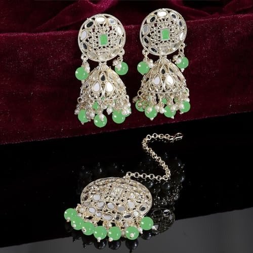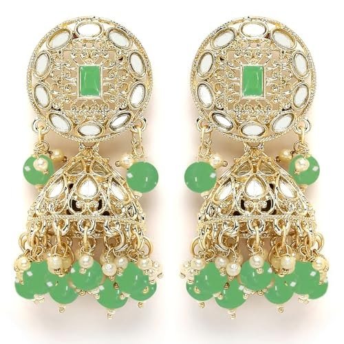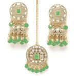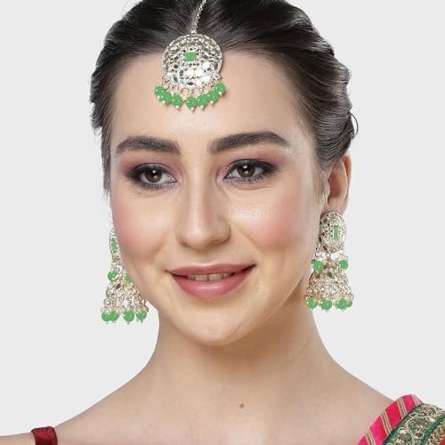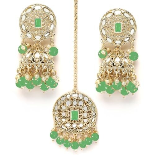 7 reviews for Karatcart Gold Plated Mirror and Light Green Bead Studded Round Jhumki Earring and Maangtikka Set – Fast Shipping to USA & Canada