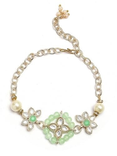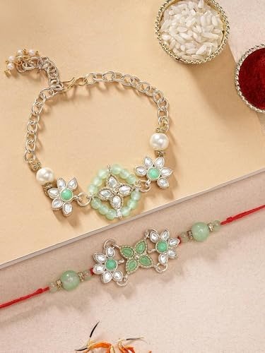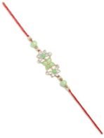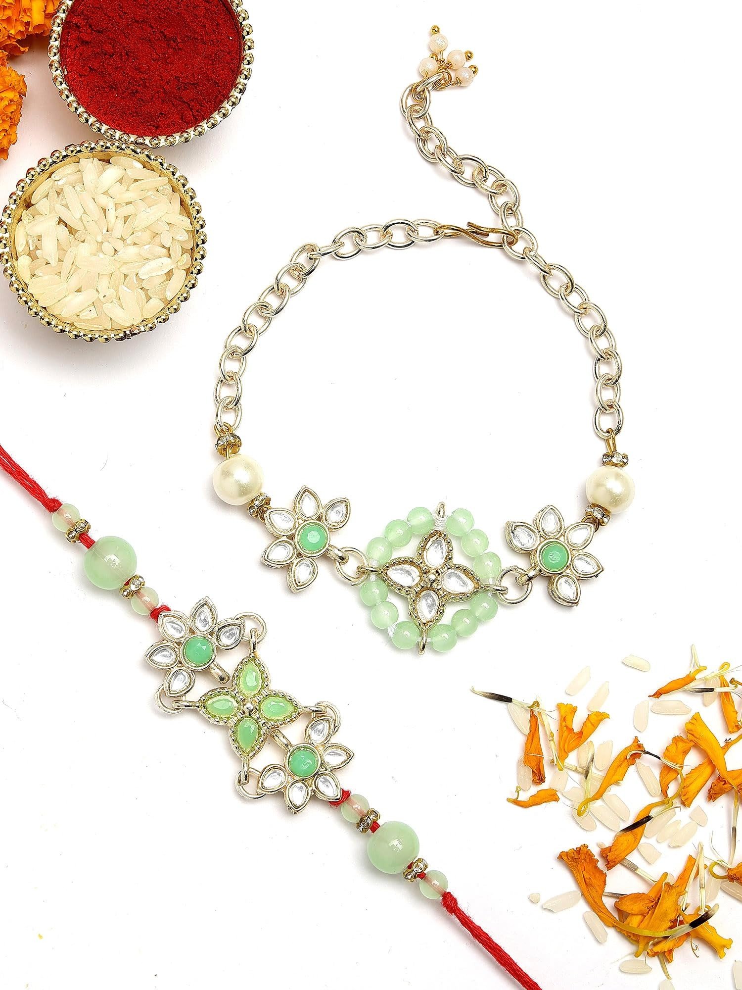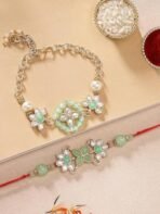 Karatcart Light Green Beads Floral Design Handmade Kundan Bhaiya Bhabhi Rakhi with Roli & Chawal – Fast Shipping to USA & Canada