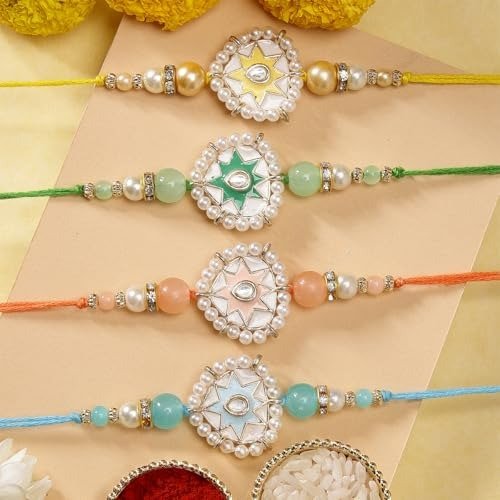 Karatcart Set of 4 Handmade Meenakari Heart Shape Kundan Rakhis for Brother with Roli & Chawal – Fast Shipping to USA & Canada