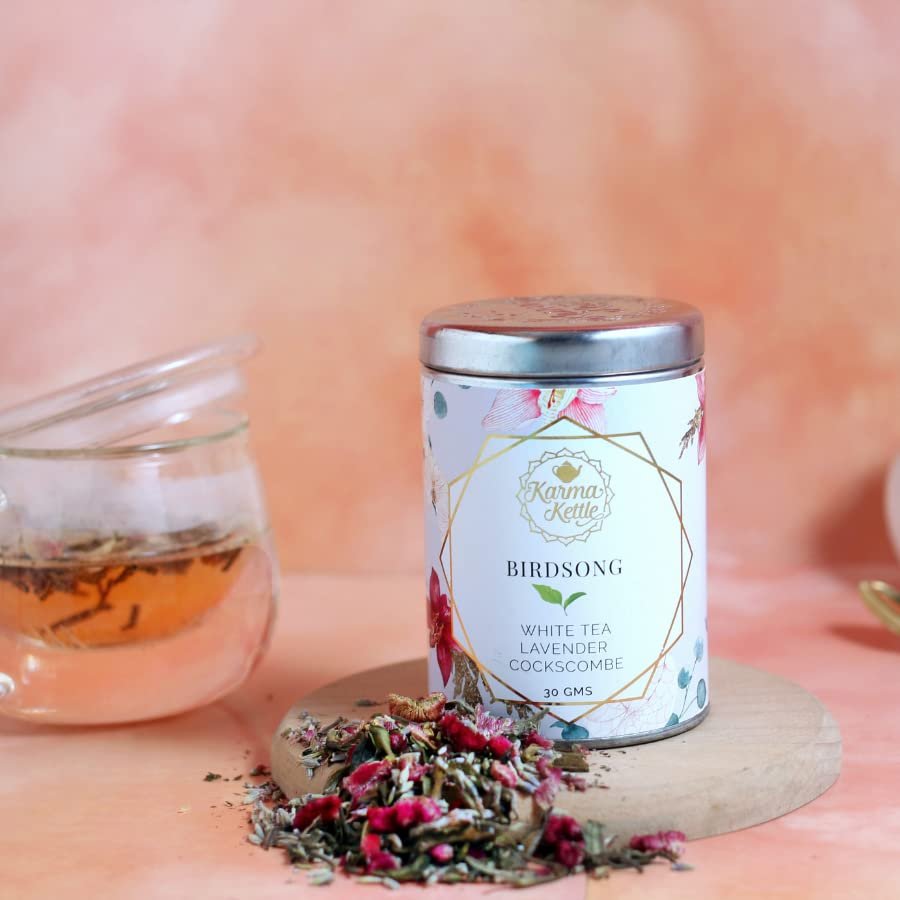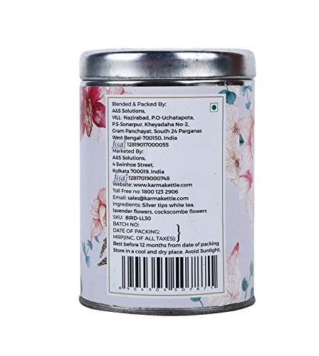Karma Kettle Birdsong Silver Tips White Tea with Lavender Flowers, Cockscombs Flowers (30 g Loose Leaf Tin), 30 g – Fast Shipping to USA & Canada