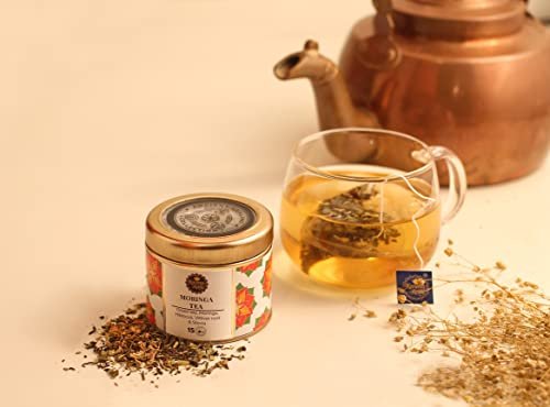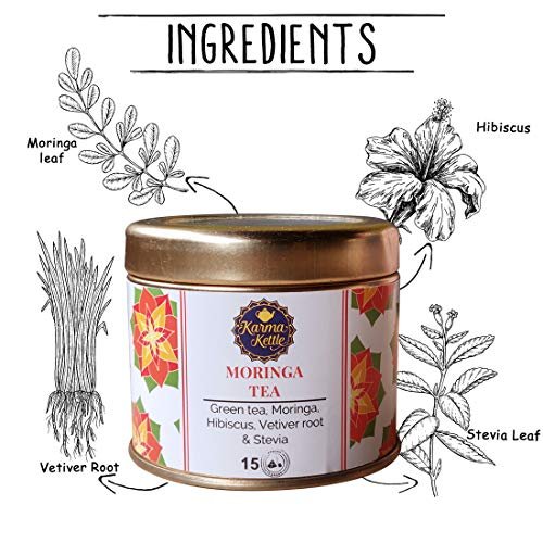 Karma Kettle Moringa Green Tea with Moringa Leaf, Hibiscus Flower, Vetiver Root & Stevia Leaf (15 Pyramid Teabags), 30 g – Fast Shipping to USA & Canada