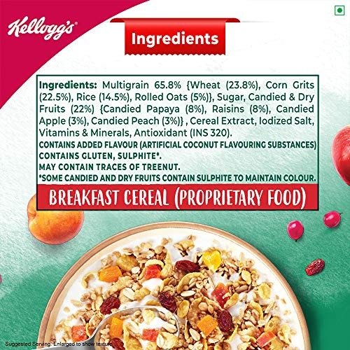 - A blend of four wholesome grains?wheat, oats, rice, and corn?combined with four delectable additions, including candied and dried fruits such as papaya, apple, peach, and raisins, creates a convenient and tasty breakfast cereal that is ready to enjoy.
