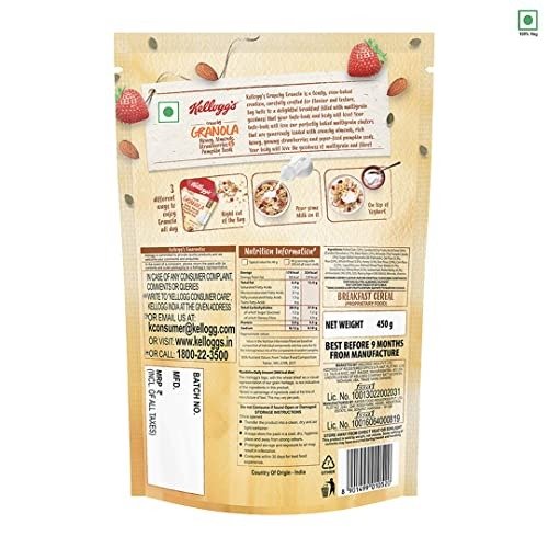 Kellogg’s Crunchy Granola is a deliciously toasted, oven-baked blend, thoughtfully crafted for optimal flavor and texture. Embrace a delightful breakfast filled with multigrain goodness that your taste buds and body will adore! Your palate will rejoice at our perfectly baked multigrain clusters, generously packed with crunchy almonds, luscious honey, delectable strawberries, and nutrient-rich pumpkin seeds. Your body will appreciate the wholesome benefits of multigrain and fiber!