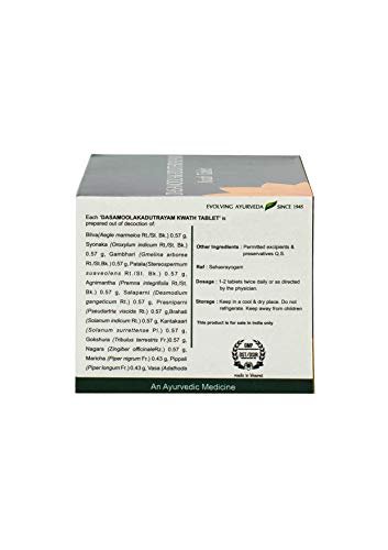 - Quantity: 100 units; Form: Tablets; Dasamoolakaduthrayam Kwath Tablet is a herbal remedy specifically designed to address elevated body temperature. It promotes healthy digestion and aids in alleviating flatulence.