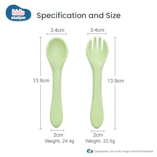 - KIDS STATION ESSENTIAL FEEDING SET (2pcs): The Kids Station Essential Feeding Set includes a silicone fork and spoon. Designed to cover all your requirements, this comprehensive childrens tableware set supports your childs feeding journey from their first bites of solid food as infants through their toddler stage.