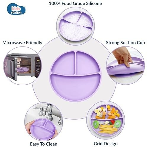 Kids Station 3 Piece BPA-Free Silicone Baby Feeding Set – Baby Plate – Spoon and Bowl – Make Mealtime Fun – Microwave Safe – Unbreakable Eco-Friendly – Organic & Natural (Plate (Set of 3), Purple) – Fast Shipping to USA & Canada