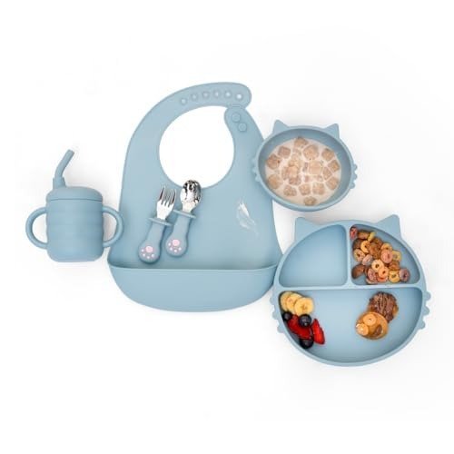 Kids Station 6 Piece BPA-Free Cat Shaped Silicone Baby Feeding Set – Baby Bib – Plate – Fork – Sipper – Spoon and Bowl – Make Mealtime Fun and Easy for Your Little One (Blue) – Fast Shipping to USA & Canada