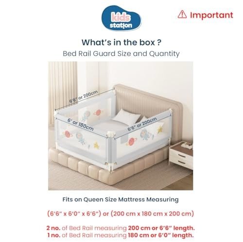 Kids Station Baby Bed Rail Guard for Kid Safety (6.6ft x 6ft), 200cm x 180cm, H-2’6 Or 80Cm, Adjustable Height, Foldable Safeguard for Baby Proofing King Size Bed (6’6 X 6’0, 3 Side, Grey, Printed) – Fast Shipping to USA & Canada