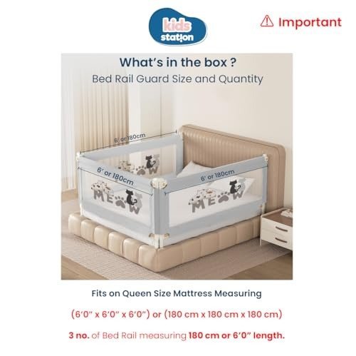 Kids Station Bed Rail Guard for Baby Safety ? 6ft x 2.6ft (180x80cm), Foldable Safety Rail for Newborns, Patented, Made in India, King Size Bed (3 sides, 6ftx6ftx6ft or 180cmx180cmx180cm, Grey, Basic) – Fast Shipping to USA & Canada