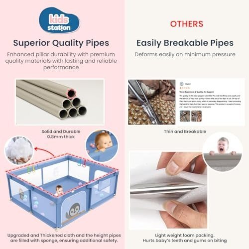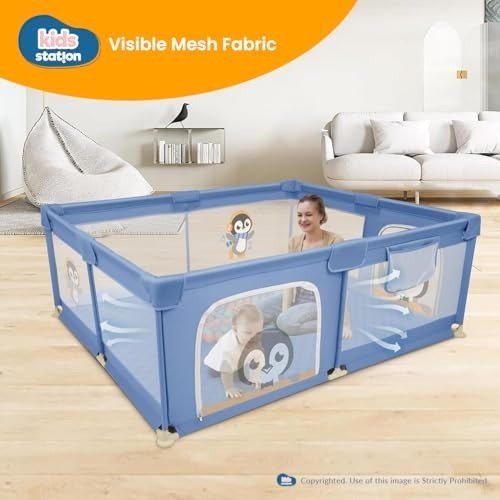 Kids Station Non-Foldable Baby Playard Playpen – Spacious – For Infants upto 4 Years – With Extra Thick Mattress – Storage Pocket and Anti-Fall Grasp Rings – Kids Activity Center with Safety Lock – 6ftx5ft or 180x150cm (Blue) – Fast Shipping to USA & Canada