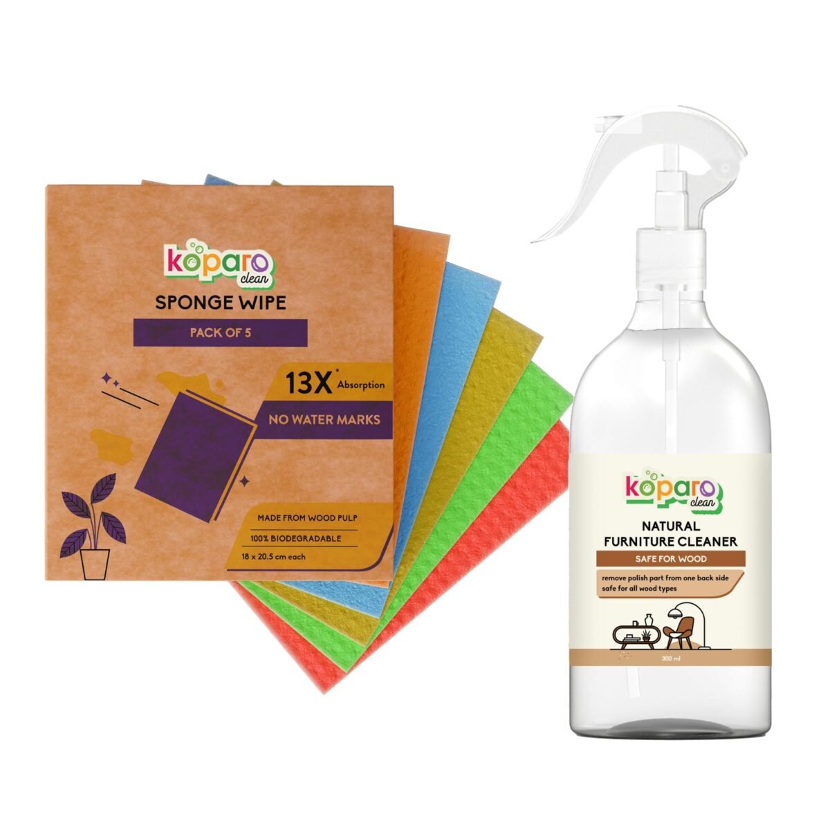 Koparo Clean Natural Furniture Cleaner and Natural Cellulose Based Sponge Wipes Combo-Kids and Pet Safe | Eco-friendly – Fast Shipping to USA & Canada