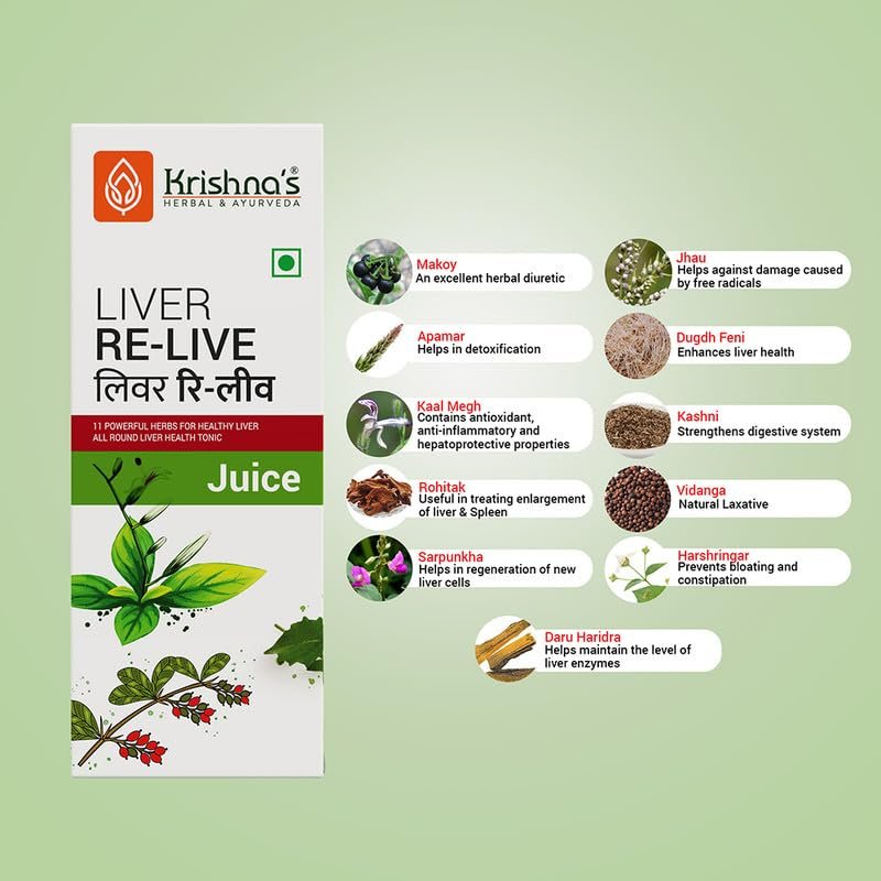 - Krishna’s liver juice is infused with a variety of essential herbs in ideal concentrations, designed to deliver comprehensive support for restoring liver function.
