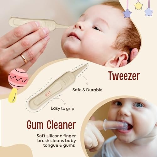 This all-in-one newborn care set has everything you need for your baby?s oral, nail, and hair care. It includes a finger brush for gently cleaning your baby?s tongue and gums, a soft-bristled hair brush for delicate scalps, and a comb with rounded, anti-scratch teeth. You?ll also find an easy-grip, high-quality nail scissor, a nail clipper for shaping and trimming tiny nails, a nail filer to smooth rough edges, and a tweezer to help clear nasal congestion.