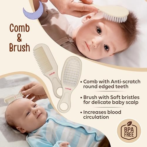 - Scissors with rounded tips and combs with smooth, rounded teeth help prevent scratching your baby?s delicate skin. The hairbrush?s soft nylon bristles gently care for your baby?s scalp, while the silicone finger brush makes it easy to keep your baby?s gums and tongue clean.