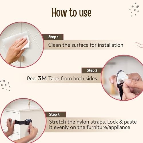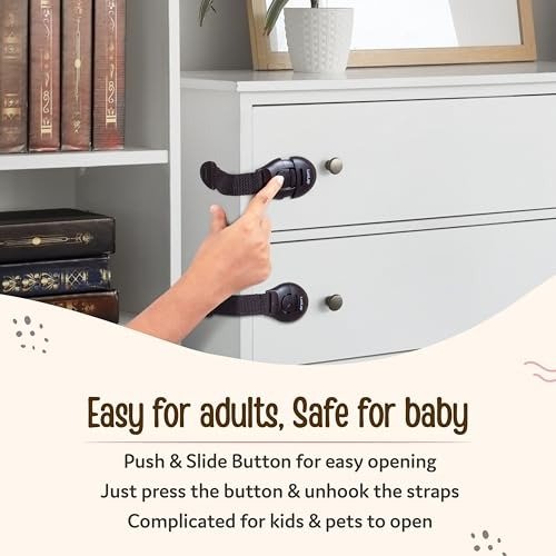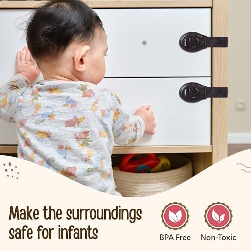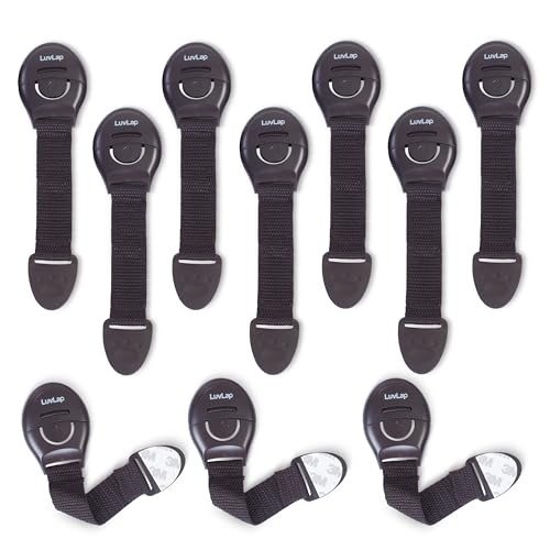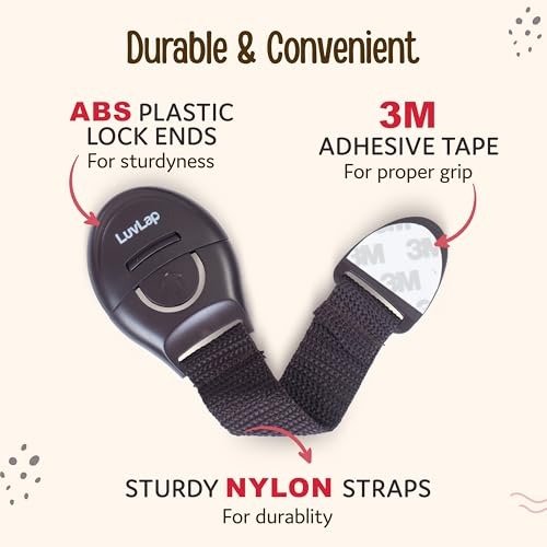 - Set of 10 baby safety drawer locks made with durable nylon straps and strong 3M adhesive. Perfect for securing both flat surfaces and corners, helping keep your little one safe around the house.