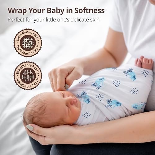 - Pack of 3 Baby Swaddles ? Each swaddle measures 120 x 100 cm and is made from 100% cotton muslin. They?re incredibly soft, breathable, and gentle on your baby?s skin, and they get even softer with every wash. The lightweight fabric allows for better airflow, helping to keep your baby comfortable and prevent overheating.