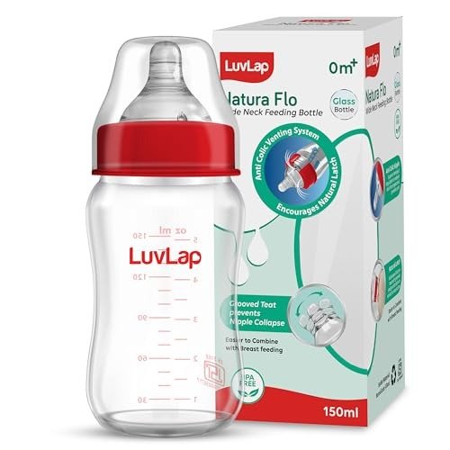 LuvLap Natura Flo Wide Neck glass bottles are designed specifically for feeding newborns and young children. The bottle features a wide neck and a screw-on lid that holds a silicone nipple, allowing babies to drink in a way that closely mimics breastfeeding. This makes it especially helpful for mothers who are returning to work or have difficulty breastfeeding, as the bottle can be used alongside or instead of nursing. Glass bottles are also easier to clean, don?t absorb flavors or odors, and are known for being durable and long-lasting.
