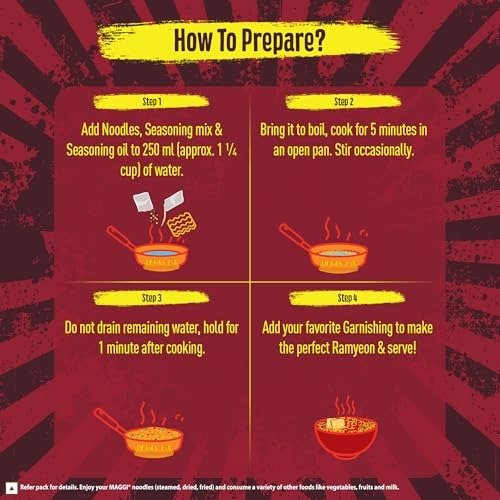 A vibrant bowl of flavor that truly delivers a kick! Are you a fan of spicy noodles in search of something delectable for your palate Look no further! Indias beloved brand MAGGI has finally introduced the eagerly anticipated Korean noodles! Treat yourself to a spicy experience with these instant noodles, where Korean barbecue meets intense chili that hits the mark! MAGGI Korean BBQ chicken noodles present an enticing blend of globally renowned Korean tastes with the signature MAGGI flair. These instant noodles are ideal for a quick snack when you desire something hot, tasty, and convenient. So, grab your chopsticks and savor this fiery bowl of delicious ramyeon anytime! Cooking Instructions: Add the noodles to 400 ml (approximately 2 cups) of boiling water and cook for 3 minutes in an open pan. Drain the water. Incorporate the seasoning mix and seasoning oil, and stir well. Add your favorite toppings to create the perfect Ramyeon and serve! Storage Guidelines: Keep in a cool, dry, and hygienic location to safeguard against insects, pests, and strong odors.