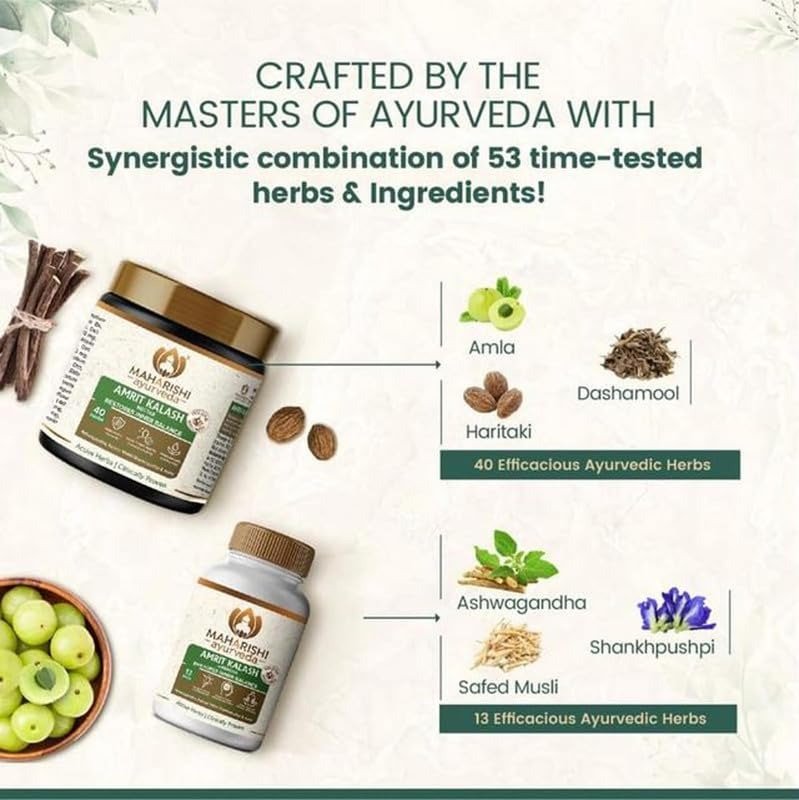 - Confidence in outcomes: Supported by more than 81 research studies from around the world, Amrit Kalash is created using traditional Ayurvedic techniques. Employing 25 careful steps and a harmonious combination of 53 herbs, each batch is meticulously crafted to ensure the nutritional integrity of every component is maintained.