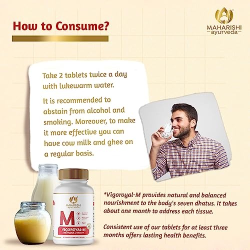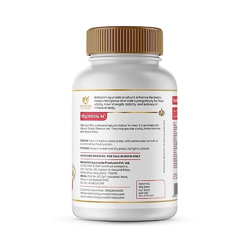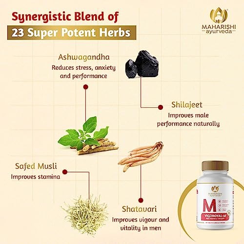 - COMBINATION OF POTENT AYURVEDIC HERBS: Maharishi Ayurveda Vigoroyal-M is a powerful formulation comprising 23 Ayurvedic herbs, such as Ashwagandha, Shatavari, and Pure Shilajeet. This blend nourishes and harmonizes the body’s seven tissues, with each tissue taking approximately a month to be addressed. For optimal and enduring health benefits, consistent use for a minimum of three months is recommended. At Maharishi Ayurveda, we are committed to enhancing our customers’ well-being through effective remedies.