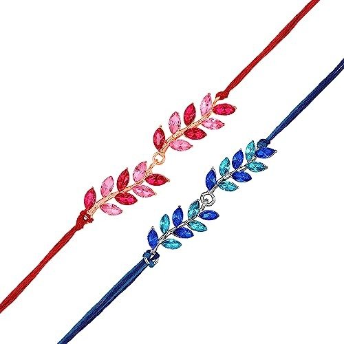 Mahi Combo of 2 Leaf Shaped Beautiful Rakhis with Red Pink and Blue Coloured Crystals for Bhai (RCO1105531M) – Fast Shipping to USA & Canada