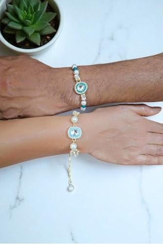7 reviews for Mahi Gold Plated Classic Kundan and Artificial Pearl Studded Ethnic Couple Rakhi Set for Bhaiya and Bhabhi (PARCOL1105728PR) – Fast Shipping to USA & Canada