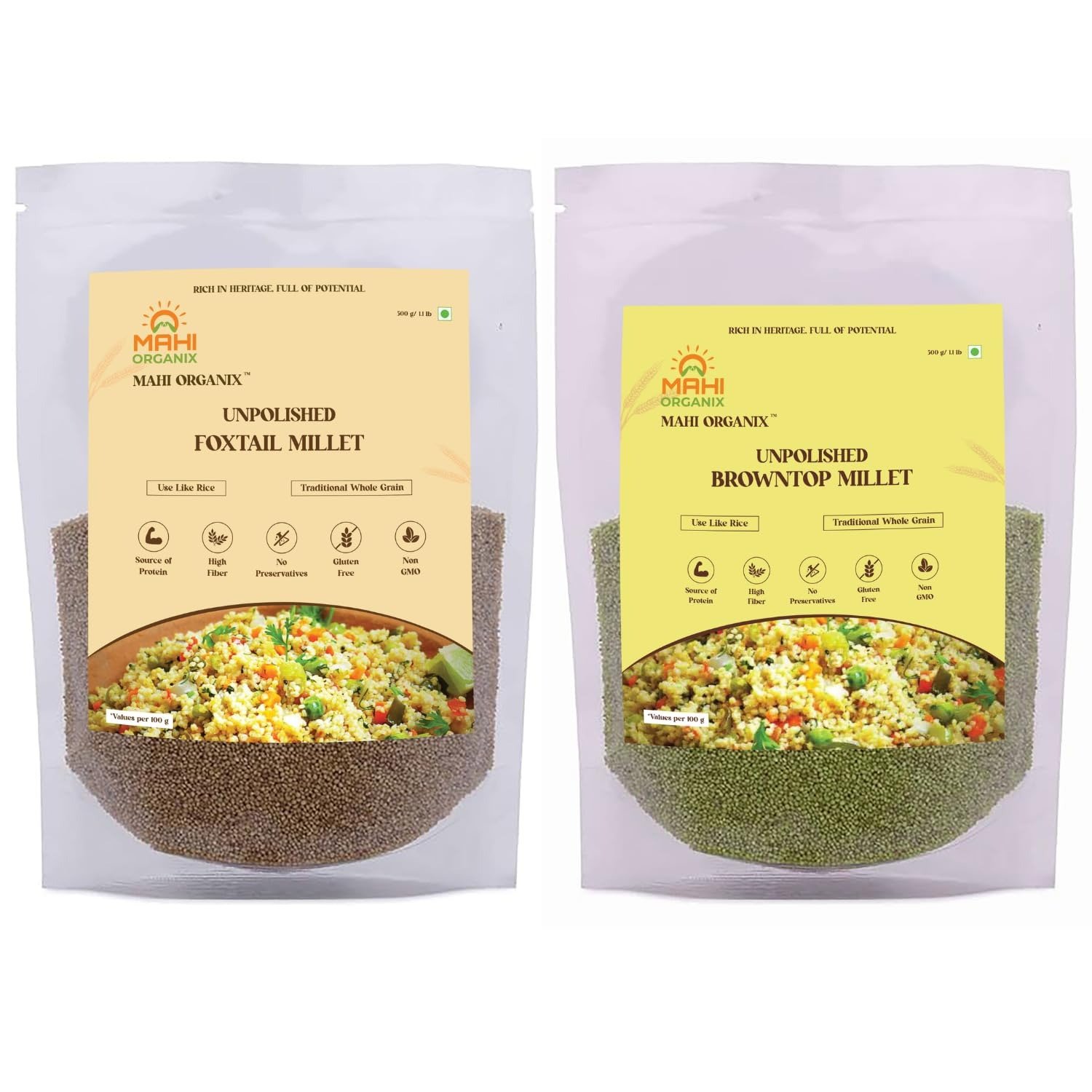 Mahi Organix Unpolished Foxtail Millet & Browntop Millet Combo Pack of 2 | (Kangni/Korralu/Korra/Korale/Koralu/Andakorra) | 100% Organic | More Fibre Than Rice, (450gx2) Combo – Fast Shipping to USA & Canada