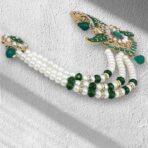 Create unforgettable moments with this exquisite collection of kalangi from Mahi. This elegantly designed kalangi, featuring a stunning golden finish, is adorned with layered mala in green, white crystals, and artificial beads. This kalangi brooch perfectly enhances all your wedding attire, whether traditional or contemporary.