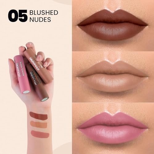 • Matte Lipstick Trio for Women | Enduring Wear | Silky Texture | Hydrating | Intense Color in One Swipe (3×3.2 gm) (05-Blushed & Nudes) SET OF 3 LIPSTICKS CREAMY MATTE FINISH WITH LONG-LASTING FORMULA HIGHLY PIGMENTED FOR EASY APPLICATION IN JUST ONE SWIPE