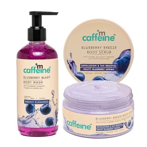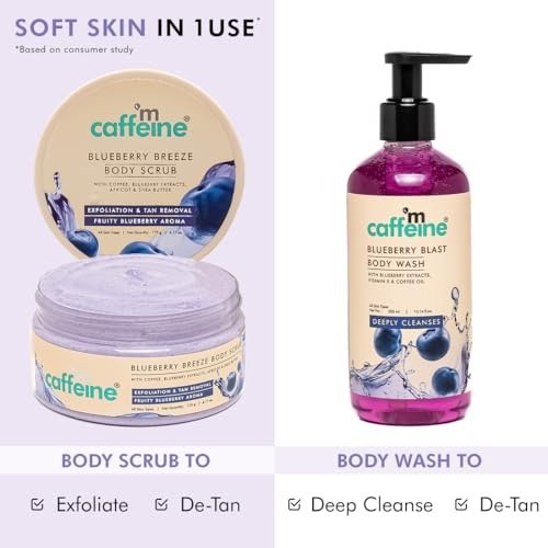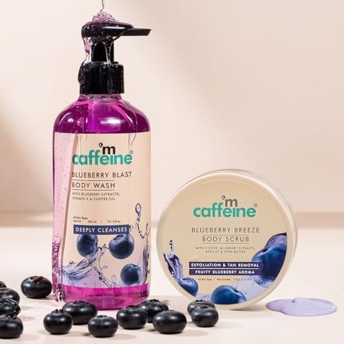 mCaffeine Blueberry Blast Detan & Cleanse Duo for Glowing Skin| Deep Cleanses, Exfoliates, Nourishes| Blueberry Body Wash – 300ml & Bluberry Scrub – 175 g | Fruity Blueberry Aroma for Men & Women – Fast Shipping to USA & Canada