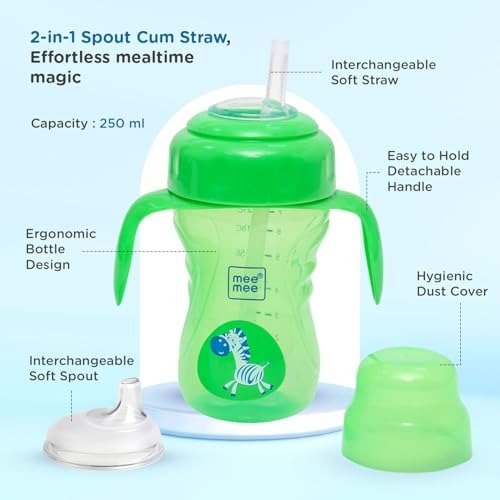 Mee Mee?s sipper cup is a great option for parents who want a safe and easy-to-use drinking cup for their kids. The 360-degree soft spout lets toddlers drink from any side, which is especially helpful as they?re learning to use a cup. Its twin handles are designed for small hands, making it easy for little ones to hold on their own. Made from BPA-free, 100% food-grade materials, the cup is safe for your child. Plus, its leak-proof and spill-proof design means fewer messes for you to clean up. All in all, Mee Mee?s sipper cup is a practical and dependable choice for parents and their toddlers.