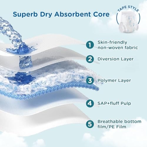 - TAPED STYLE DIAPER: Our tape-style diapers are designed with a high waist and 360-degree stretch, so your baby can move and play comfortably without feeling heavy or restricted. The adjustable waistband ensures a snug, cozy fit-just like a gentle hug-keeping your little one happy and comfortable all day long.