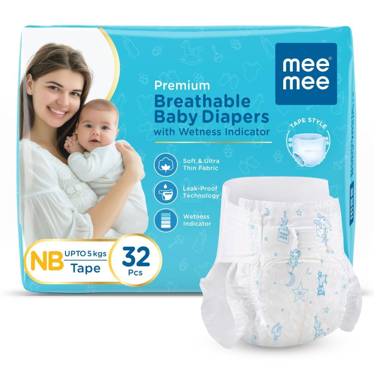 Mee Mee Premium Breathable Baby Diapers | (NB) Size Baby Taped Diapers | 32 PIECES | Skin Friendly, Super Absorbent, Cotton Soft with Wetness Indicator (Newborn, 32 PIECES) – Fast Shipping to USA & Canada