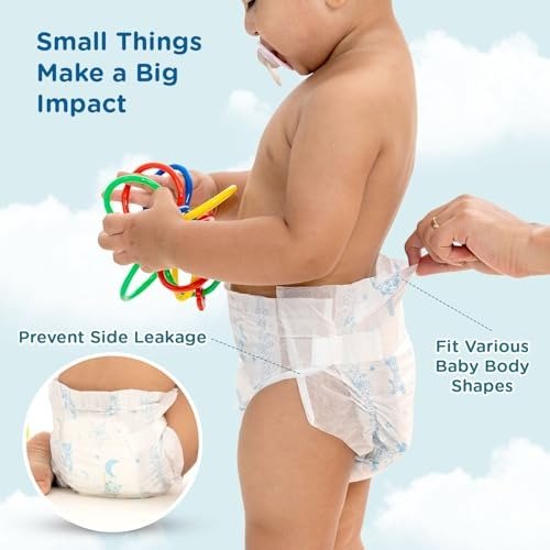 • TAPED STYLE DIAPER: Our tape-style diapers feature a high waist and 360-degree stretch, letting your baby move freely and play comfortably without feeling heavy or restricted. The adjustable waistband ensures a snug, cozy fit-just like a gentle hug for your little one.