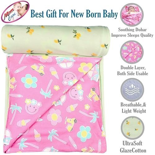 MOM CARE Cotton Baby Blanket for Summer New Born Baby Dohar Super Soft Double Layer Infants Toddlers revesible for 0-4 yrs Pink and Green 150cm X 100cm – Fast Shipping to USA & Canada