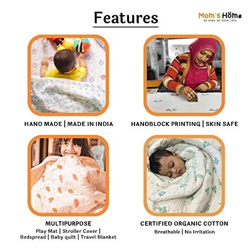 Moms Home Combo Gift Pack ? This set includes 1 AC quilted blanket, a pack of 4 muslin cloths, 1 six-layer muslin blanket, and a pack of 3 pairs of socks. Specially designed for babies aged 0-3 years, these items are crafted from the softest certified organic cotton, ensuring purity and comfort as gentle as a mother?s love. Ideal for keeping your little one cozy and warm in air-conditioned rooms or during mild winters, these versatile pieces can be used as bedspreads, play mats, or swaddles. The quilts are reversible, exceptionally soft to the touch, and highly breathable. Dyed with eco-friendly colors, they help protect your baby?s delicate skin from irritation and rashes. Featuring beautiful hand block prints in soothing designs, these blankets are visually appealing and perfect for cuddling, making them a favorite for your bundle of joy.