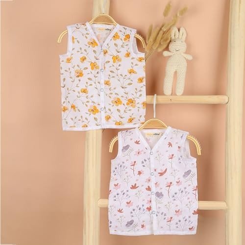 Moms Home 100% organic muslin cotton baby jhabla and nappy set. This ultra-comfortable outfit is crafted from highly breathable fabric that becomes even softer after each wash. The material is prewashed and free from any harmful dyes. Offered in adorable, summery patterns.